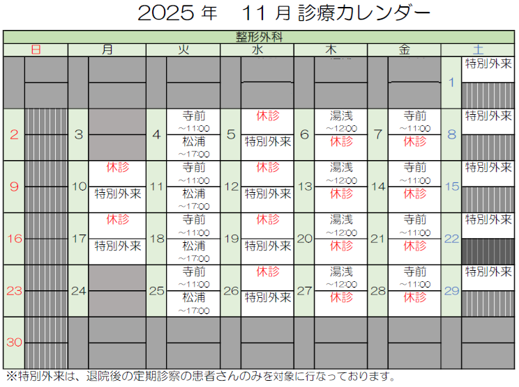 ※予約優先診療や診察時間が短い枠がございます。 ご来院の際は下記担当表をご確認ください。